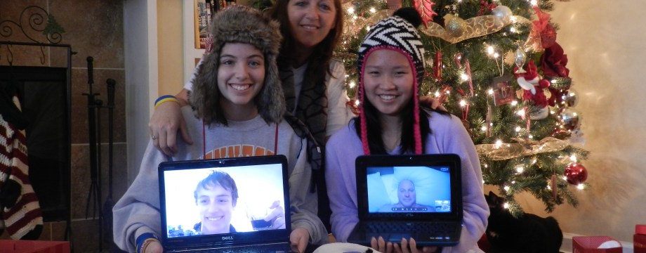 It was our goal to show our Chinese exchange student a traditional Christmas, but this year was far from the norm. In keeping this post lighthearted, I won’t tell you about all the drama, the tragedy, or the travels that came our way. Instead, I will tell you that in spite of it all, I was aglow on Christmas morning. The two girls and I opened presents with my hubby on one computer and my son on the other (skype, you gotta love it). We laughed and joked, and when the girls got preoccupied with gifts, the guys conversed as they sat side by side on the coffee table. We even took a family photo in front of the tree.